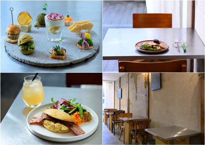 (左上)ランチもコースも前菜は、旬の素材で少しずつ味わえるワンプレートを (右上)ディナーのメイン料理など素材を活かした料理が楽しめ(右下)二人席もある店内(左下)朝食で楽しめるサンドウィッチも人気