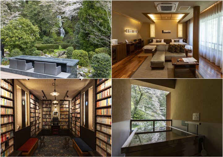 (左上)滝亭の名の由来ともなった美しい落水「宝生の滝」と「辰巳の滝」がある(右上下)辰巳亭にある天然温泉半露天風呂付き客室、月うさぎ&風の音(左下)辰巳亭にはメインライブラリーの書庫兎夢。またArt Bookギャラリーこもれびもある