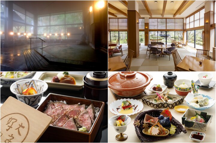 (左上)客室以外にも、露天岩風呂や大浴場を完備 (右上)ロビーラウンジからは中庭に植えられた四季桜が見える(右下)日帰りランチの滝しぶき御膳6000円。掘りごたつ式の個室で楽しめる (左下)日帰りランチのひとつ1日5食限定「能登牛重」3300円。カウンター席で味わえる