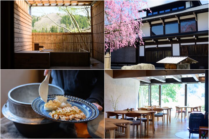 (左上)自然を借景にして絵画みたいな風が楽しめる、ヒバ造りの風呂(右上)エントランスは春になると桜が咲く(右下)陽光差し込むカフェ&レストラン。建物は「奥飛騨おもちゃ博物館」として活躍していた建物を移築(左下)要予約のランチは羽釜で炊いたごはんもご馳走