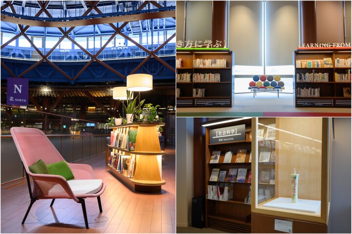(左上)加賀前田家ゆかりの成巽閣を彷彿とする深みのある群青色が特徴的な天井(右上)1階にある石川県に関するコレクションのコーナー(右下)2階閲覧エリアにあるカラフルなソファ(左下)ハムアンドゴー 石川県立図書館カフェの営業時間は閲覧エリアに準ずる