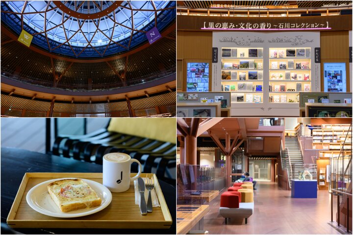 学生の町で知られる、金沢市小立野(こだつの)にある「石川県立図書館」。金沢駅東口から北鉄バス石川県立図書館行に乗り約30分で到着し館内へ。思わず見上げてしまう4階までの巨大な吹き抜け空間は、まるで円形劇場のようなアートな場所です。 2022年夏に移転し、新しく開館。「思いもよらない本との出会いや体験によって、自分の人生の1ページをめくることができる場所」というコンセプトどおり、「仕事を考える」「好奇心を抱く」など、12のテーマで分かりやすく分類された本が約8万冊あります。「里の恵み・文化の香り~石川コレクション~」というコーナーもあり、県内各地をさまざまな角度から知る本、旅のヒントがもらえそうな一冊もありますよ。