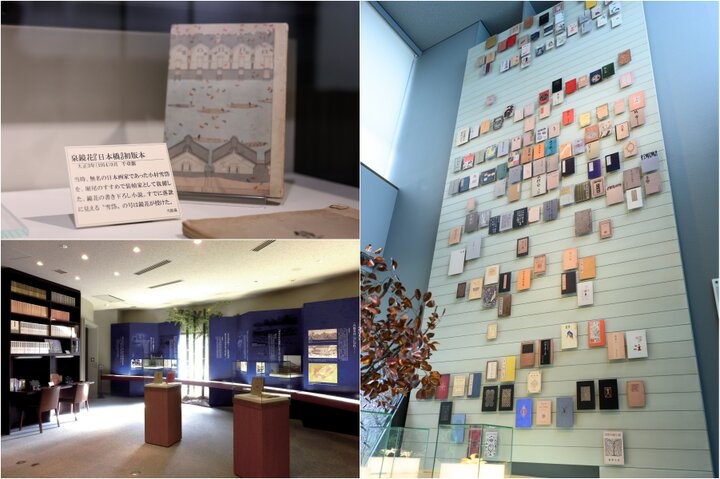 (左上)泉鏡花の作品は装丁が美しいことでも人気。初版本なども展示する(右)室生犀星の作品約160冊を下から上へ年代順に紹介する壁(左下)徳田秋聲の生い立ちから小説家になるまでのあゆみなどを紹介する1階