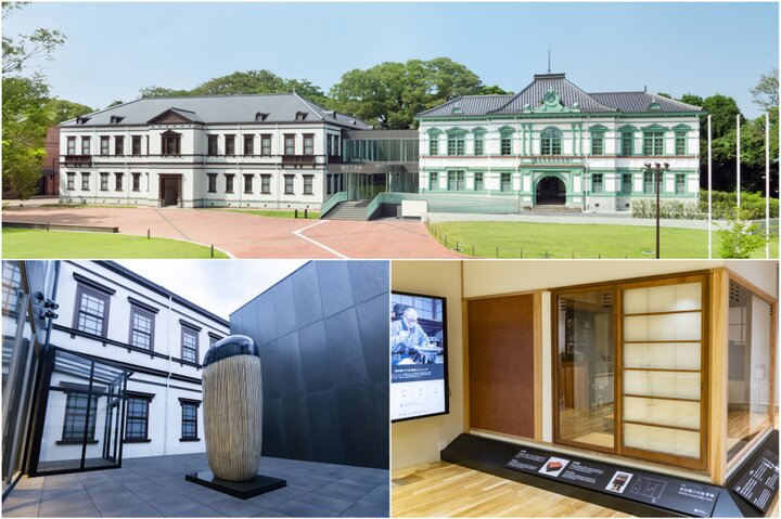 (上)明治建築のクラシックな西洋風外観 ©金沢市(左下)高さ3mを超える陶器作品はパーツを組み立てるのではなく一体で制作されたことに驚く。金子潤《無題 13-09-04》(右下)金沢出身の漆芸家・松田権六(1896-1986)の工房を移築・復元。人間国宝の仕事場を垣間見ることができる