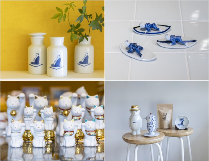 (左上)花入れや筆立てにも使えそうな、薬瓶 笛吹(右上)ユニークな姿に思わずクスッと笑う、サーファー箸置き(右下)くまの蜂蜜瓶や鳥型醤油さしなど食卓にあると楽しくなりそうなアイテムがいろいろ(右下)より福を呼びそうな招き猫