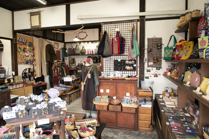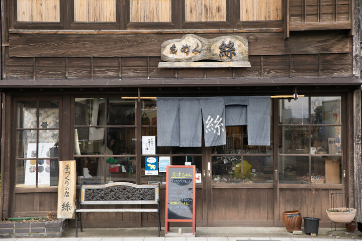 「澁川問屋」と同じ七日町通りにたたずむ「もめん絲」は、会津の伝統的な織物・会津木綿の生地を扱う専門店。風合い豊かな会津木綿の反物をはじめ、バッグやポーチ、洋服、小物、アクセサリーなど、会津木綿を使ったハンドメイド商品を豊富に取りそろえています。