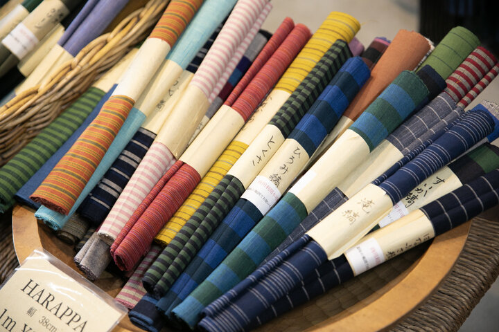 会津木綿は、野良着として重宝されてきたため丈夫で、使うほどにふっくらとやわらかくなるのが特徴。「育てる」布地として人気を集めています。昔は紺地ベースの白い縞模様が定番でしたが、今は色も柄も多種多彩。手芸用にはもちろん、テーブルセンターなどインテリア目的として生地を購入していく人も多いといいます。