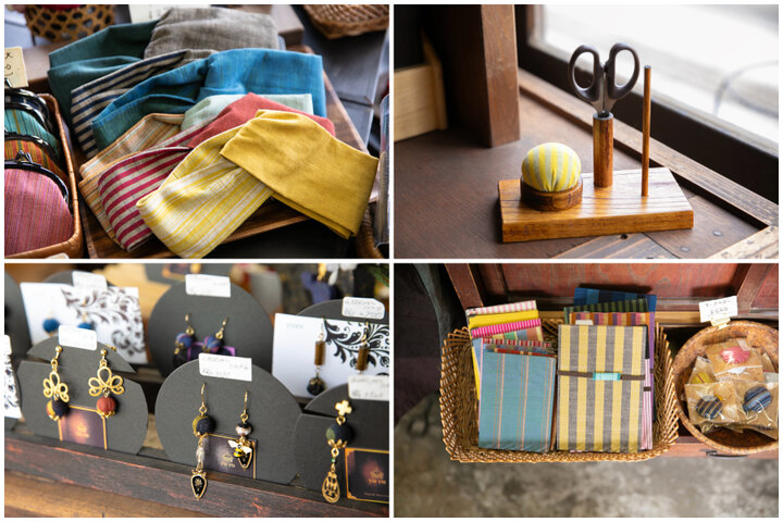 店内には、生地のほかにも普段の暮らしに寄り添う商品がたくさん。ターバンやピアスなど、現代風にアレンジされたアイテムも気になります。どれも手作りの温もりがあり、手にとって眺めていると時間が経つのも忘れそう。じっくり選んで、自分だけのとっておきを見つけてくださいね。