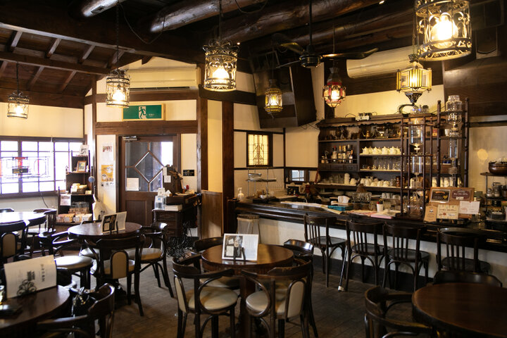 アンティークのインテリアが配された店内は、どこかノスタルジックで落ち着いた雰囲気。まるで時が止まったかのように、明治や大正の時代へと迷い込んだ気分にさせてくれます。木枠の窓からはやわらかな自然光が差し込み、自家焙煎コーヒーの香りがふわりと鼻をくすぐります。しばしスマートフォンはしまって、本を片手に、注文した一杯をゆっくり待つ時間を楽しみましょう。