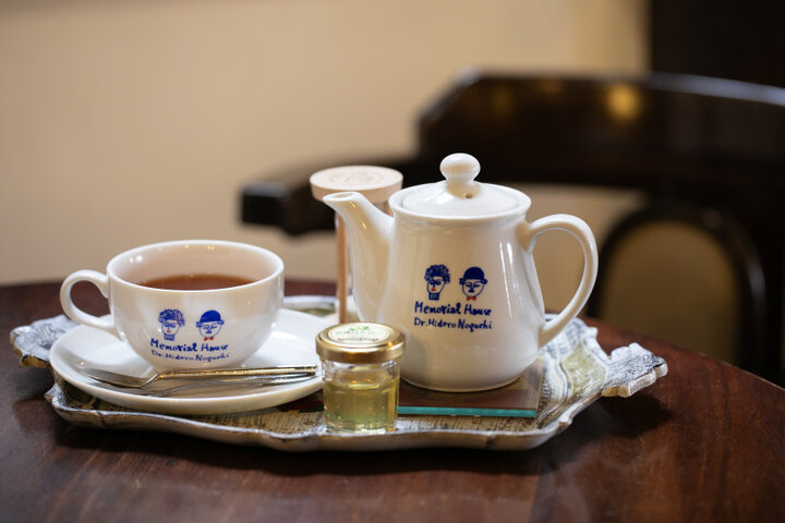 このカフェならではのドリンクといえば、会津産100%のはちみつがついた「会津はちみつ珈琲」と「会津はちみつ紅茶」。最初のひと口はそのまま味わい、そのあとお好きな量のはちみつをスプーンで加えていただきましょう。小瓶で提供されるはちみつはお持ち帰りOK。おうちでもう一度味わえるのがうれしいですね。野口英世のイラストが描かれたおしゃれなカップやティーポットにも注目です。