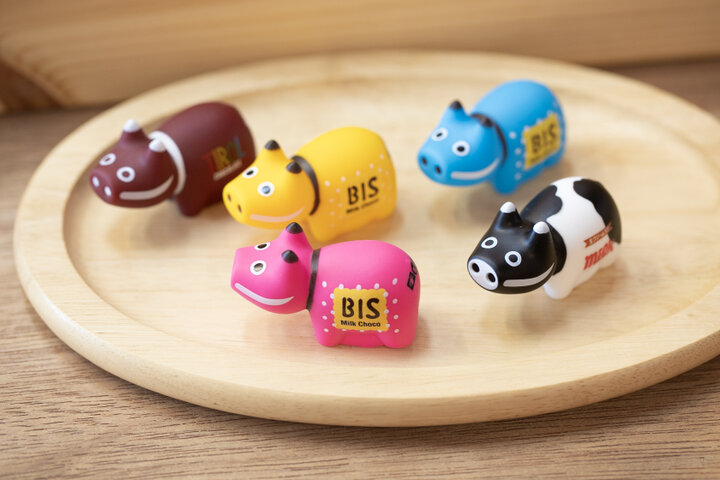 チロルチョコの人気フレーバーをモチーフにしたチロル赤べこ 各3300円、チロル豆だるま 各1100円
