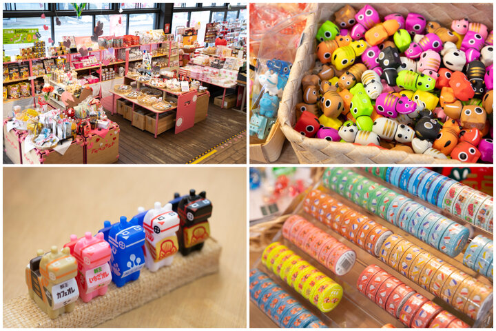 左上:1階のショップ。会津のおみやげも豊富 右上:豆サイズのぷかぷかシリーズ350円 左下:ぷかぷか三春駒5種セット2000円 右下:マスキングテープなどの文具も注目