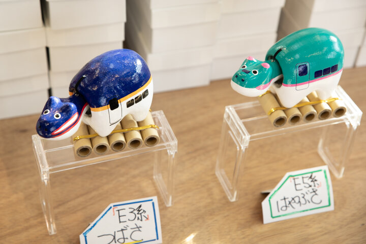 走る縁起物、新幹線赤べこ。左はE3系つばさ、右はE5系はやぶさ 各3300円