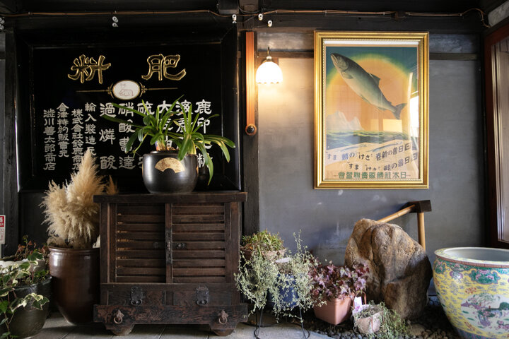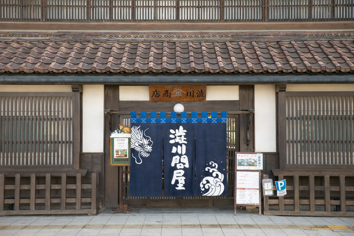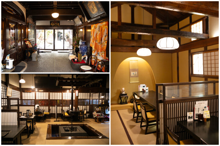 旧商家を生かした和風建築。大きなのれんをくぐって店内へ
