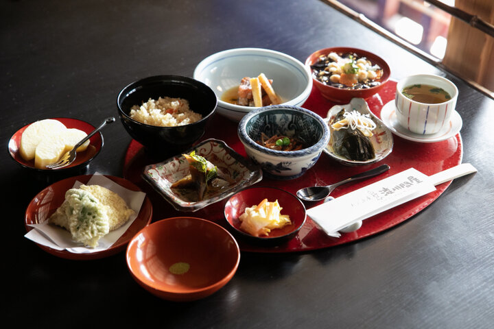 いただけるのは、会津郷土料理の定番であるこづゆをはじめ、ニシンの山椒漬、棒タラ煮など、祝い膳にも使われる山海料理。海に面していない会津では、干物が貴重なたんぱく源だったといいます。素材の持ち味を大切にしながら、ひと皿ずつ手間ひまかけてていねいに。盛り付けやうつわも美しく、少しずつ多彩な料理を楽しめるのも魅力です。