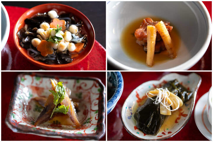 左上:こづゆ 右上:棒タラ煮 左下:ニシンの山椒漬 右下:ニシンの昆布巻