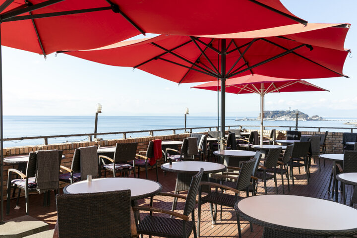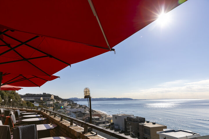 海と空に包まれる赤いパラソルのテラス♪七里ガ浜「Amalfi DELLA SERA」