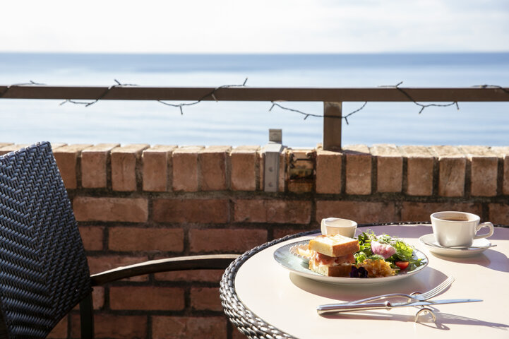 週末や祝日には、少し早起きをして訪ねるのも素敵です。休日限定のモーニングでは、フォカッチャに生ハムとモッツァレラチーズを挟んだサンドイッチのプレートが用意されています。澄んだ空気の中で、キラキラと輝く海を眺めながら味わう朝食は、心のリセットにも。