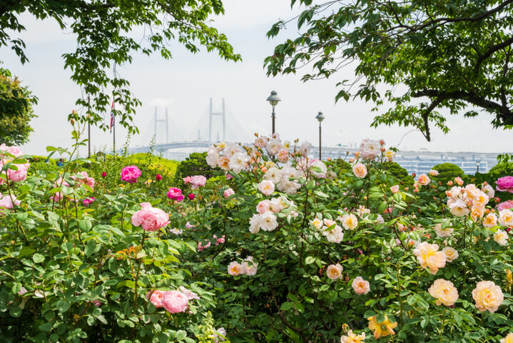 バラ 時期:5月上旬〜5月下旬、海の見える丘公園「イングリッシュローズの庭」