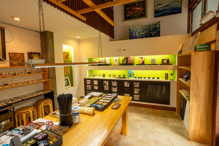 JR城崎温泉駅から歩いて10分ほど。温泉街の中心にある休憩スポット「木屋町小路」の一角にある「かみや民藝店」は、三代続く麦わら細工の工房兼専門店です。 店内には桐箱をはじめ、色とりどりのブローチやペンダントトップなど職人が手がける多彩なアイテムがずらりと並び、光を受けて上品に輝く麦わらや、繊細で美しい模様を間近で見ることができます。
