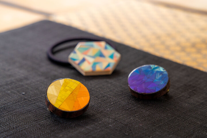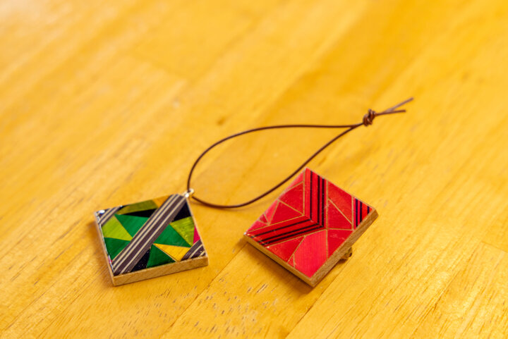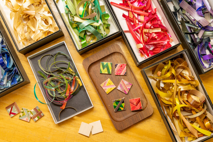 色染めされた状態のカラフルな麦わらの中から色を選び、好みの柄を描き込んだ四角形の木板に切って貼り付けていくとできあがり。完成品は約1週間後に自宅に郵送してくれます。 小さなサイズがかわいらしく、気軽に身に着けられるのもうれしいポイント。旅先の体験で生まれた自分だけのアクセサリーは、より愛着がわきそうです。
