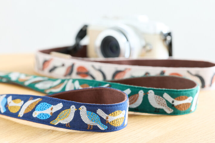 福井県の、大正時代から続く細幅織物屋で生まれた「チロルリボン」を取り入れたカメラストラップ。長時間使っても、首や肩が痛くなりにくく、アンティークカメラをはじめ、様々なカメラに取り付けることができます。 入荷するたびに完売を繰り返す、こちらのカメラストラップに、2025年秋冬の新柄が登場しました。 どこかレトロな風合いの「ベリー柄」と「鳥柄」の2種類、それぞれ3色ずつ展開しています。どのストラップにも、懐かしさと今っぽさが共存していてチャーミング。