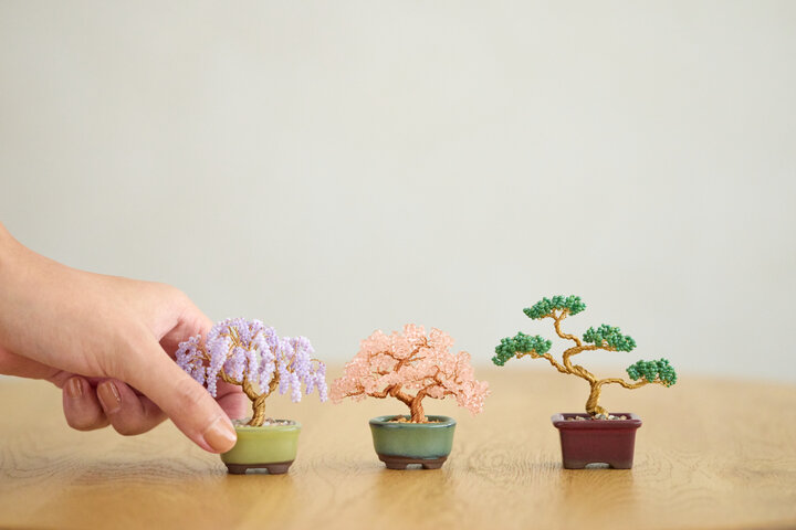 昨年、入荷後すぐに完売してしまった人気シリーズが、今年もラインナップを揃えて入荷しました。 国内はもとより、世界40 カ国以上に輸出・販売され、パーツショップが集まる東京・浅草橋にファクトリーショップを構える老舗のビーズメーカー「MIYUKI」の良質なビーズに触れられるビーズの盆栽キット。 国内外の愛好家からも高く評価される同メーカーの自慢のビーズは日本メイド。花や葉の繊細なディテールまで表現してくれます。 「ネジッテBONSAIキット」で作った盆栽は、どれもタテ約6.5 ~9.5cm ×ヨコ約5~7.5cmの手のひらサイズ。 デスクの上や玄関、ベッドサイドなど、好きな場所に並べることができます。 ビーズ、ワイヤー、粘土、砂利、鉢、説明書と、必要なものはセットになっています。