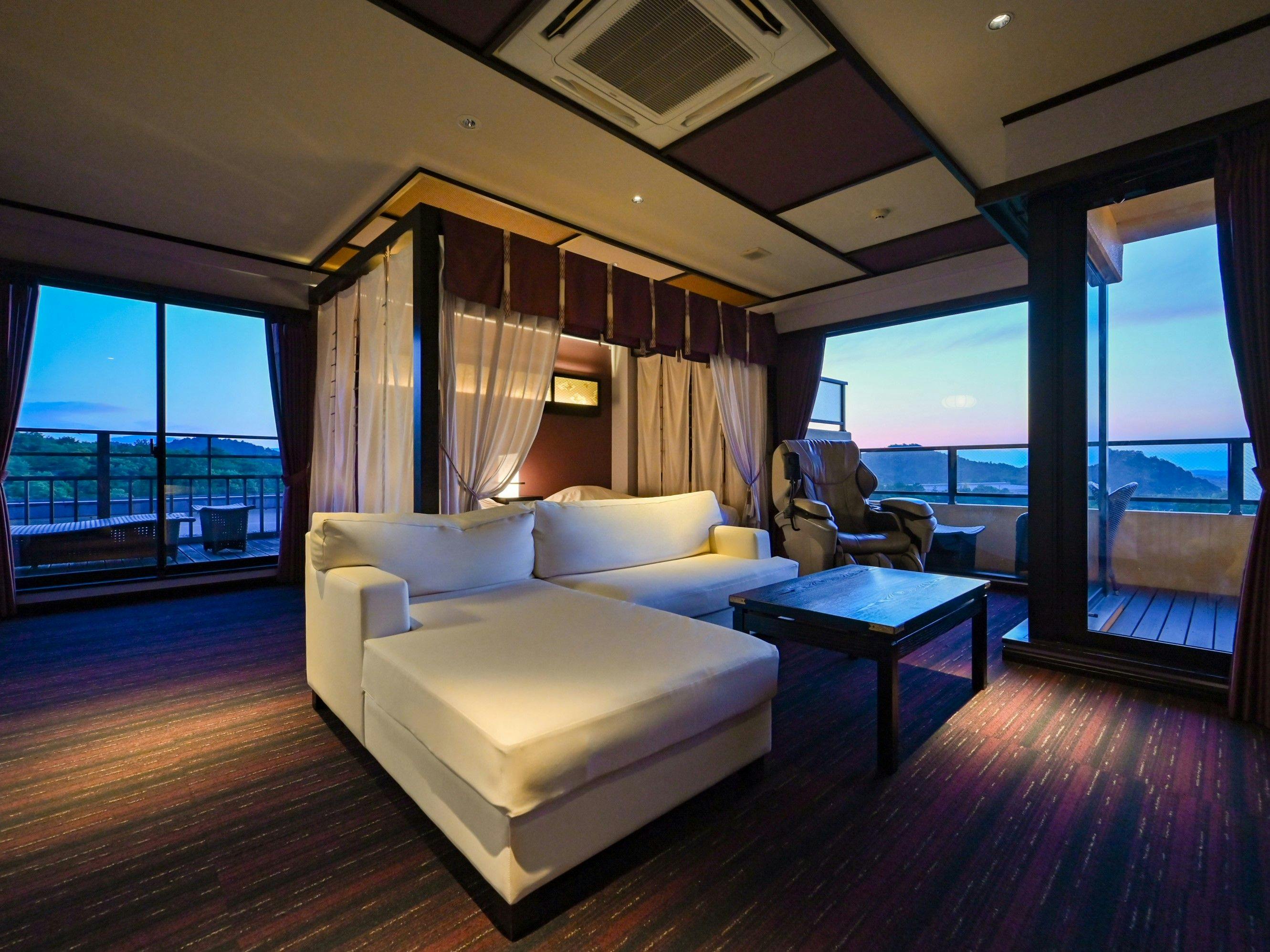 一日5組限定、ヴィラタイプの一棟建て客室は完全個室のプライベート空間。食事は、三重が誇る高級食材「松阪牛」、伊勢湾の新鮮な魚介類、豊かな自然で育った季節の野菜など、伊勢志摩を中心とした地産食材を用いて、一品一品料理人の確かな技と日本の四季を感じられる会席料理を堪能することができます。