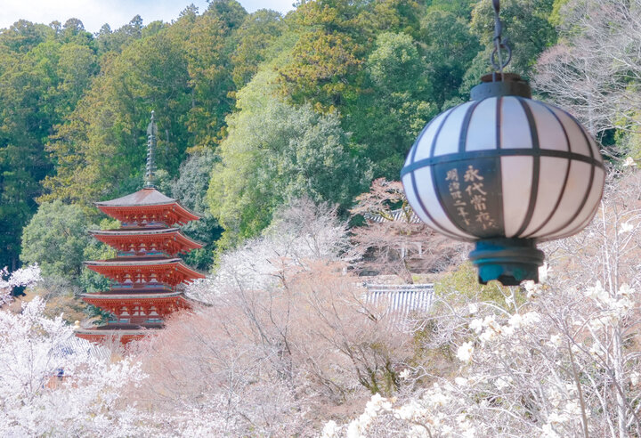 境内に建つ朱色の五重塔から眺める桜景色もまた圧巻。周囲を囲むように咲く桜が塔を華やかに彩り、春らしい景色が広がります。日本に4塔のみ現存する檜皮葺きの塔として知られる長谷寺の五重塔は、今年で開山1300年を迎え、その記念事業の一環として現在大修復が行われています。そのため今春はこの景色を見ることはできませんが、修復後またこの華やかな景色に出会える日を楽しみにしていてくださいね。