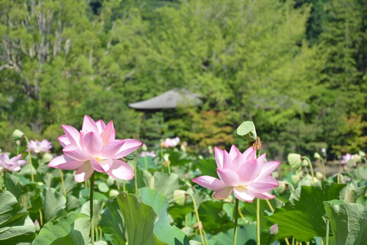 7月から8月にかけては池のハスが見頃を迎えます。秋の紅葉シーズンには幻想的な夜間拝観イベント「アミダナイト」も開催。いつ訪れても、心が洗われるような景色を楽しめます。