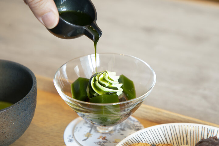もちもち食感のお団子、口の中でとろける柔らかな抹茶わらびもち、のど越しの良い抹茶・ほうじ茶ゼリーがワンプレートにまとまっています。 別添えのみつをたっぷりかけていただくと、スイーツの豊かな風味にみつの優しい甘さがとろりと合わさり、至福の味わいを楽しめますよ。