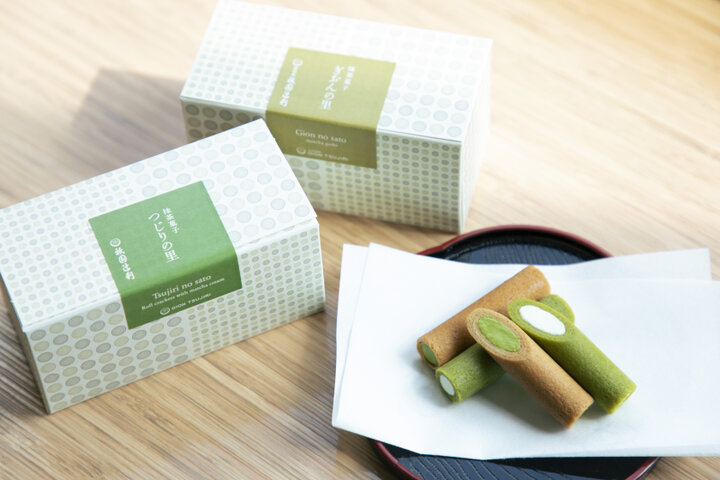 手に取るだけで心躍るパッケージとお茶請けにぴったりなお菓子「つじりの里」「ぎおんの里」(各8本・756円)