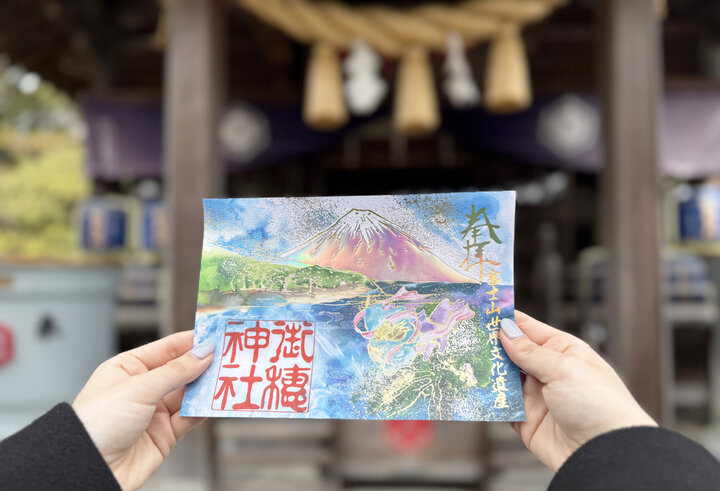 旅の証として持ち帰りたくなる「御朱印」もぜひ。おすすめは、世界文化遺産登録11周年を記念して生まれた、アートな御朱印。天女の舞い降りる松原と富士山の絶景が、鮮やかな色彩で描かれた特別な1枚です。光に当たると、キラキラしてすてき。