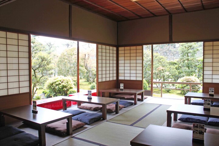 庭園の池やお城の石垣を見たり、水車が奏でる水の音や鳥のさえずりも聞こえる