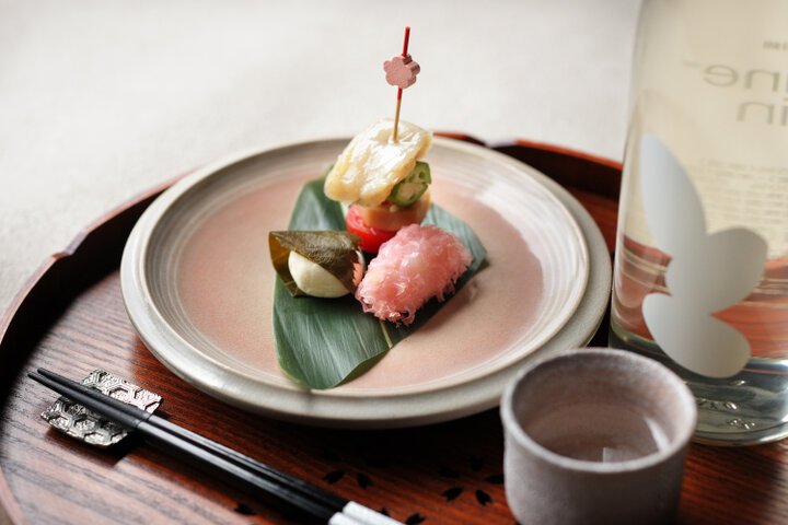 夕食前のひととき、川床テラスを貸し切った特等席で、桜を眺めながら「夜桜アペロ」をゆったり楽しむことができます。 アペロを彩る肴には、山口県名産のふぐを使い、春をイメージした3種類のメニューを仕立てました。「ふぐの生ハム」、「ふぐの香煎揚げ」、「ふぐを練り込んだ雲丹とクリームチーズの桜餅」を、萩焼の器に盛り付けて提供します。 また、花見酒として、ふぐの淡白な味わいと相性のよい、山口県美祢市(みねし)の酒造の日本酒を選定しました。