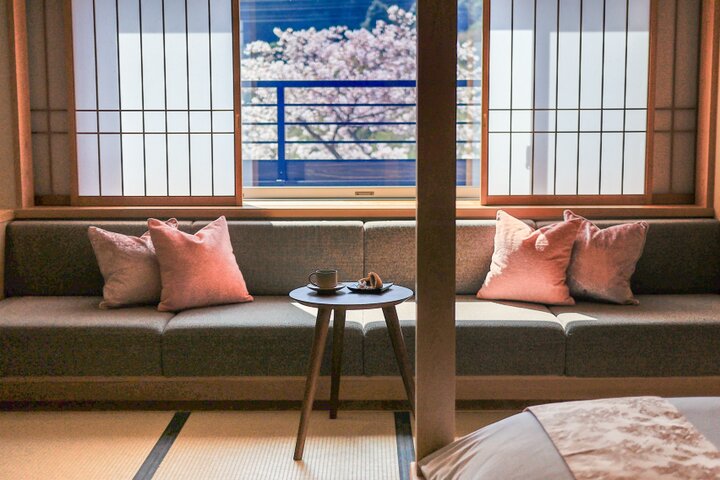 客室は桃色のクッションとベッドランナーなど、花見の気分を盛り上げてくれる特別な設えが用意されています。 窓の襖を開けると、音信川沿いの桜が目の前に広がり、プライベートな空間で桜を独り占めすることができます。