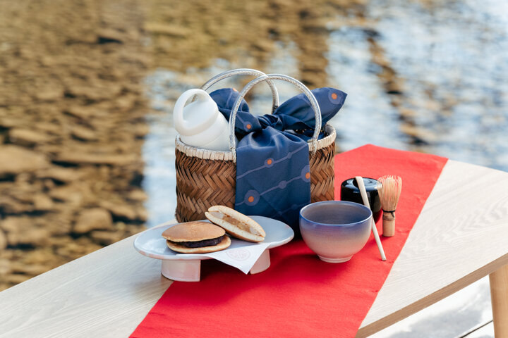抹茶のおともには、桜の時期限定のさくら餡の入ったどら焼きを提供します。 自身で点てた抹茶とともに、目の前に広がる桜を愛でる贅沢な時間を過ごすことができる体験です。