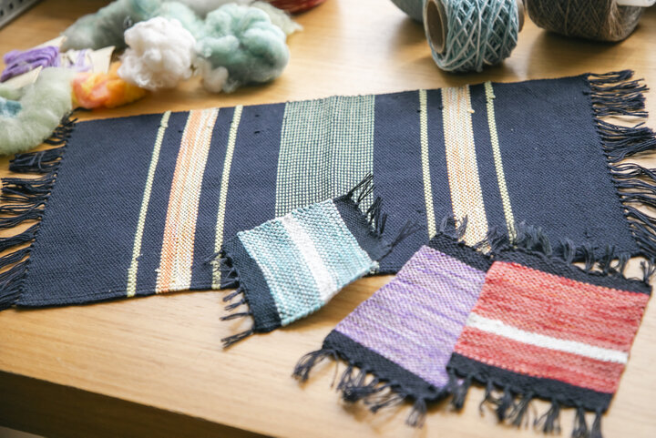 自分で紡いだ糸は、コースターの一部に加える程度。メインになる糸は、用意された中から選びます。糸を選んだら、いよいよ機織りを始めましょう。縦糸はあらかじめセットされているので、糸を巻き付けたシャトルを左右に行き来させて、横糸を織っていきます。