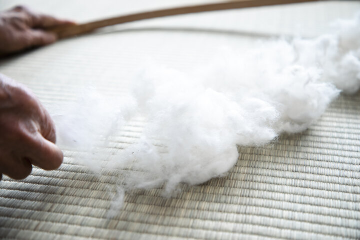 弓の弦を弾いた振動で、少しずつほぐれていく綿の繊維。古代からこの作業には弓が使われていたそう