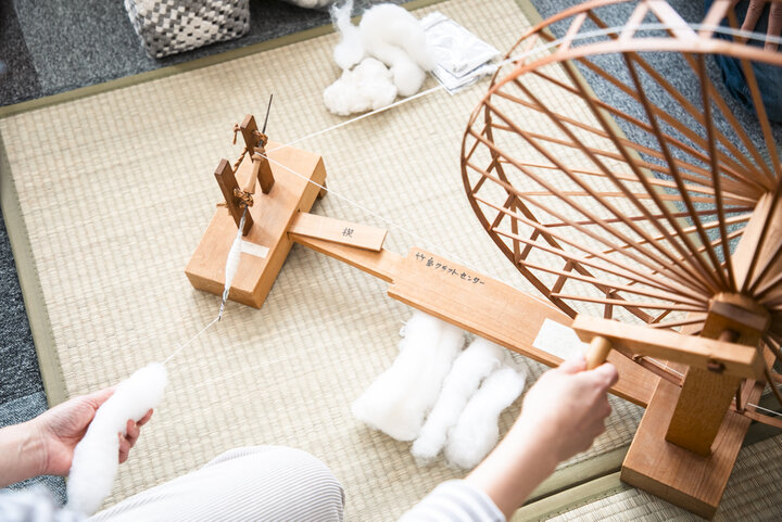 綿を糸にする作業は“糸紡ぎ”。糸車を使って、ふわふわした綿の固まりからするすると糸を引き出していく様は、とっても不思議。「見たこともない作業や道具ばかりだけど、楽しくできるかな」とご心配なく。鈴木さんが見守ってやさしく教えてくれますし、難しい作業は手伝ってくれます。綿花が糸になるまでを身をもって知ることができる貴重な体験。ぜひ、挑戦してみてくださいね。