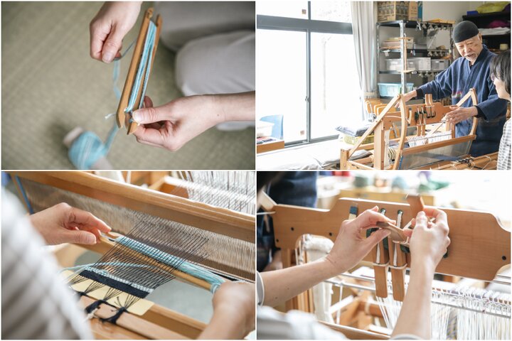 糸を巻き付けたシャトルを右に左に。足踏み式の織機ではないので、レバーを上下させて縦糸を入れ替えます(左上、下)。あたたかくて心強い、鈴木さんのナビゲート(右上)