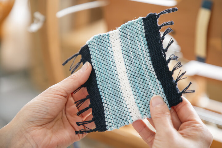 最初は鈴木さんに導かれながらおずおずとでも、徐々に調子がつかめてリズミカルに運ぶように。窓の外の竹島園地、その先に広がる海や竹島の眺めを楽しむ余裕も出てきます。 半分ほど織ったところで、先ほど紡いだ糸を織り込みます。紡いだ糸を織り切ったら、元の糸に戻して。最後は縦糸と同じ糸で端まで織り終えたら、縁でフサを作って完成。自分で織っただけでなく、自分で紡いだ糸も使われたオンリーワンのコースターができあがりました。