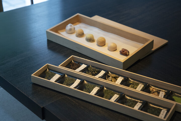 ここでは専門のスタッフが目の前で一杯ずつ、丁寧にお茶を淹れてくれます。選んだお茶は、藁(わら)で遮光し、自然仕立てで育てたという「伝統本玉露」。人肌まで冷ましたお湯を、玉露宝瓶(ぎょくろほうひん)といわれる取っ手のない平たい形の茶器に注ぎます。平たい形は茶葉をゆっくり均一に広げ、うま味を最大限に引き出してくれるのだとか。 待つこと3分。1煎目はお猪口(ちょこ)のような小さな器でいただきます。スタッフの所作には無駄がなく、思わず見入ってしまうほど。茶こしは使わず、茶葉がこぼれないよう、蓋を少しずらして丁寧に注ぐのですが、最後の一滴まで注ぎ切るのもポイント。「最後のひと雫」にこそ、旨みや香りが最も凝縮されているのだそうです。自宅でお茶を淹れるときの参考にもなりますね。