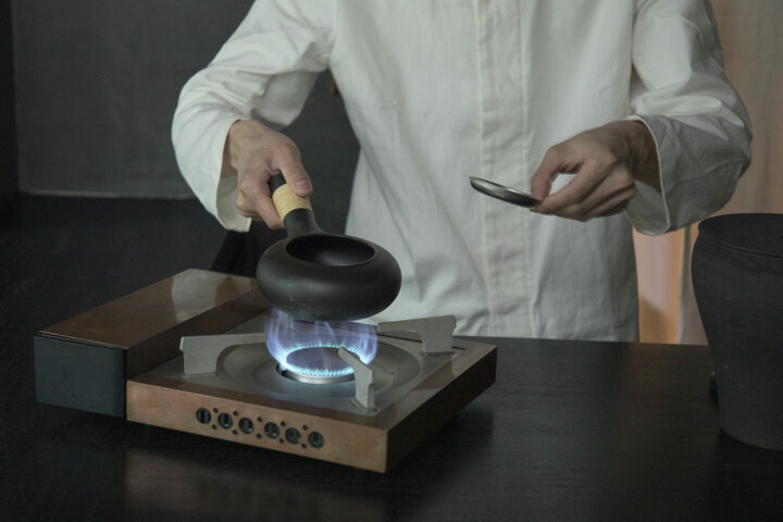 玉露の次は「自家製焙じ茶」を。HIGASHIYAオリジナルの茶葉を「焙烙(ほうろく)」で炒るところから始まります。焙烙は取っ手の先が空洞になっていて、そこから直接、茶葉を急須へ注ぎ入れることのできるお茶道具です。焙じ茶は100°Cほどの高い温度で淹れるのがおいしいとされるお茶。炒りたての茶葉に熱々のお湯を注ぎます。