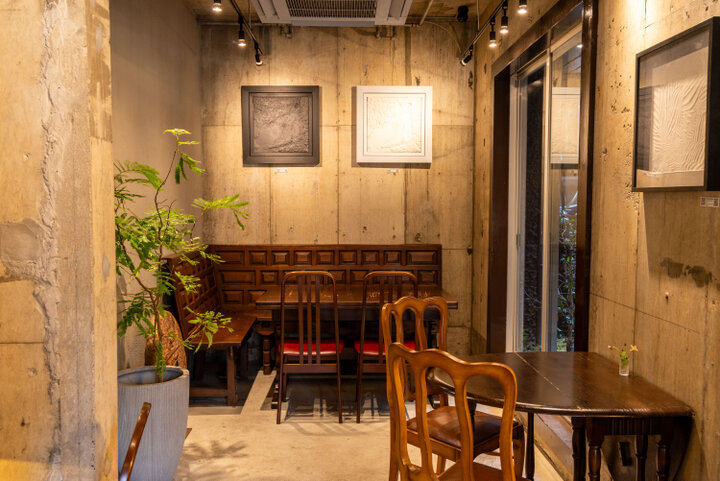 店舗ごとに異なる世界観も魅力のひとつ。「MAZE CAFE CASTLE」は、無機質なコンクリート壁とあたたかみのあるアンティーク家具が調和した、不思議な空間です。苔むした和の中庭や石をモチーフにしたアート作品など、大阪城から着想を得た要素も取り入れられ、ストーリー性のある空間づくりが素敵です。