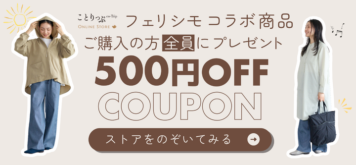 2026年4月24日(金)までの期間、フェリシモとことりっぷがコラボしたアイテムのうちいずれかをご購入いただいた方へもれなく、ことりっぷオンラインストアで使える500円OFFクーポンをプレゼントいたします。 お得なこの機会に、「フェリシモ×ことりっぷ」コラボ月間を、お楽しみください♪ ※「ご注文完了メール」にクーポンコードを記載いたします ※次回の購入時に、5000円以上お買い上げで注文全体から500円割引 ※お客様1人につき1回の利用