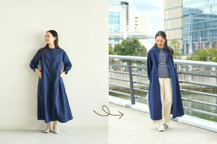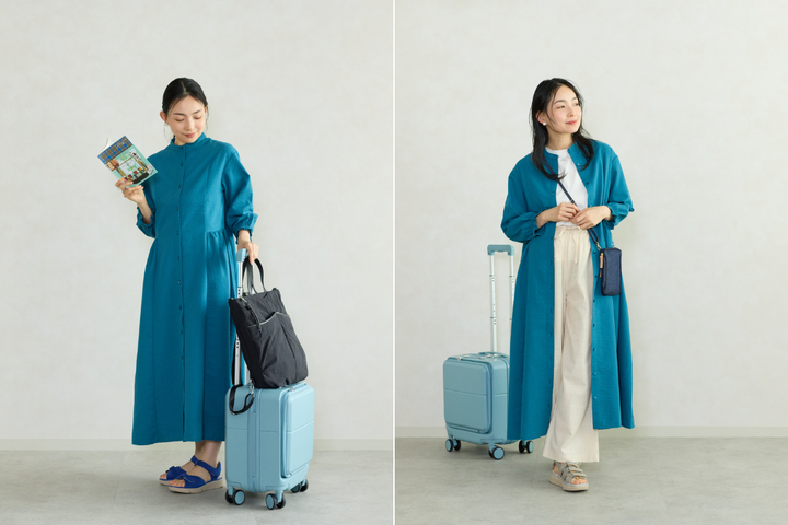 (左)ワンピースとして着るときちんと感UP(右)ボタンを開けてはおりに。旅先の温度調節アイテムとしても活躍してくれます