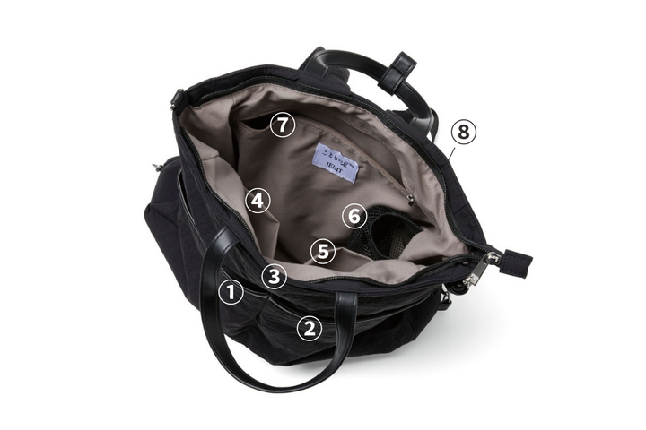 さらにリュックの持ち手は、下部を取り外して簡単に専用の背面収納スペースに入れることができる仕様。このおかげで、ショルダーや手持ちスタイルでも、持ち手がテロリンと垂れてしまう心配もありません。