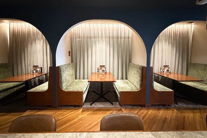 さらに、カウンター席の向かいには、ヨーロッパの鉄道にあるコンパートメントのような半個室席を完備。アーチ状の仕切りにベルベット調のソファ……。まるでポアロが乗り合わせた、オリエント急行の客車に迷い込んだみたい。