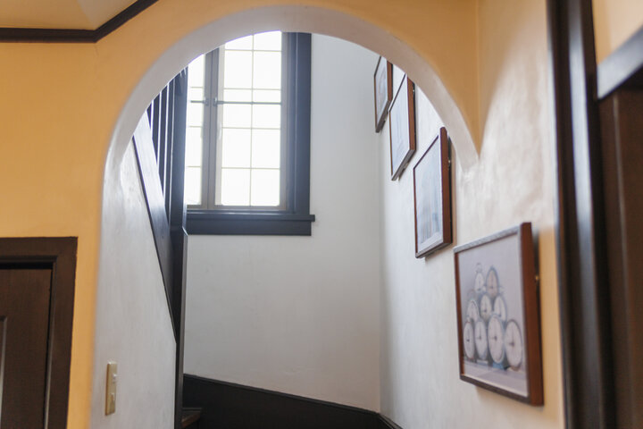階段のアーチや窓、手すりのデザインにもヴォーリズ建築の特徴が見られる